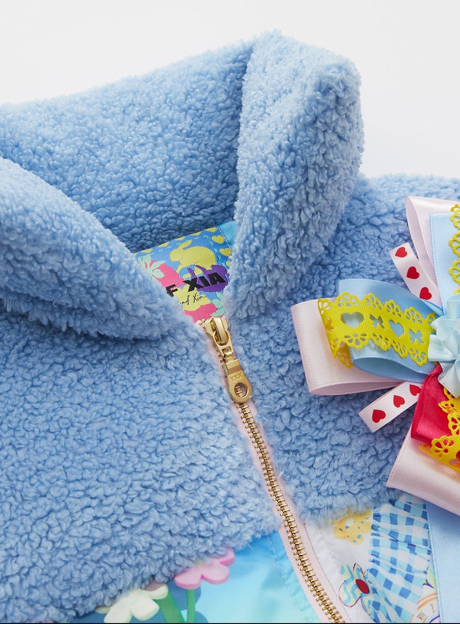 This item is made of collage print, a front zip fastening, high neck, straight self fasten hem, handmade Corsage. Made in love.
